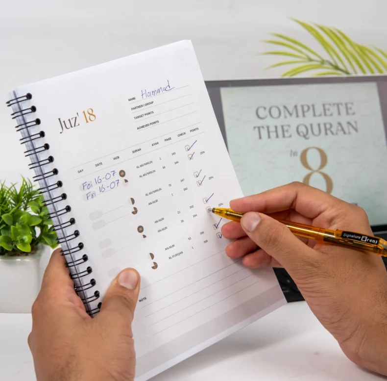 The planner is flexible. You can extend your cycle or leave a missed day blank and continue with the next portion. After completing your 8-month journey, you can review missed Juz or Surahs and revisit them in your next Quran Journey.